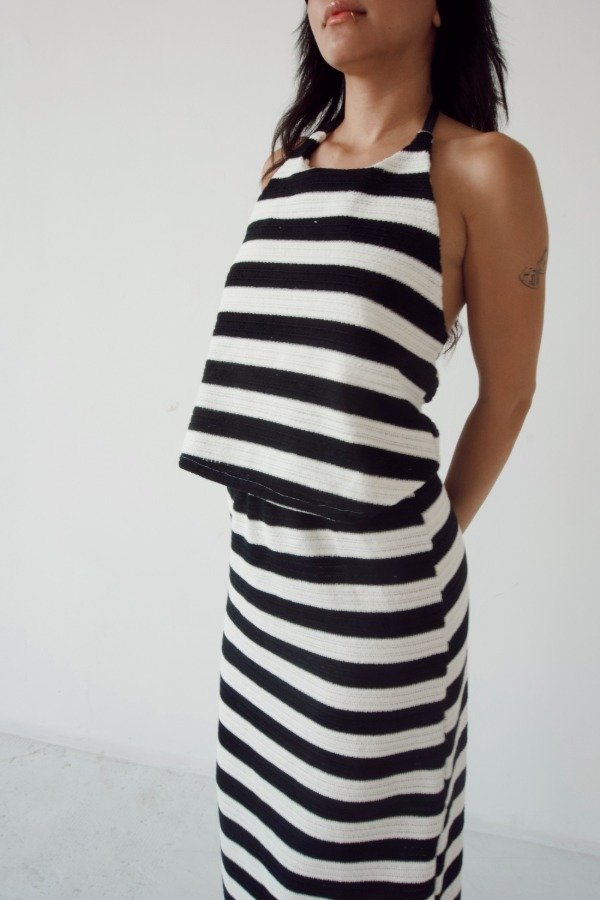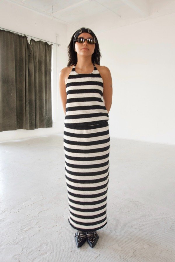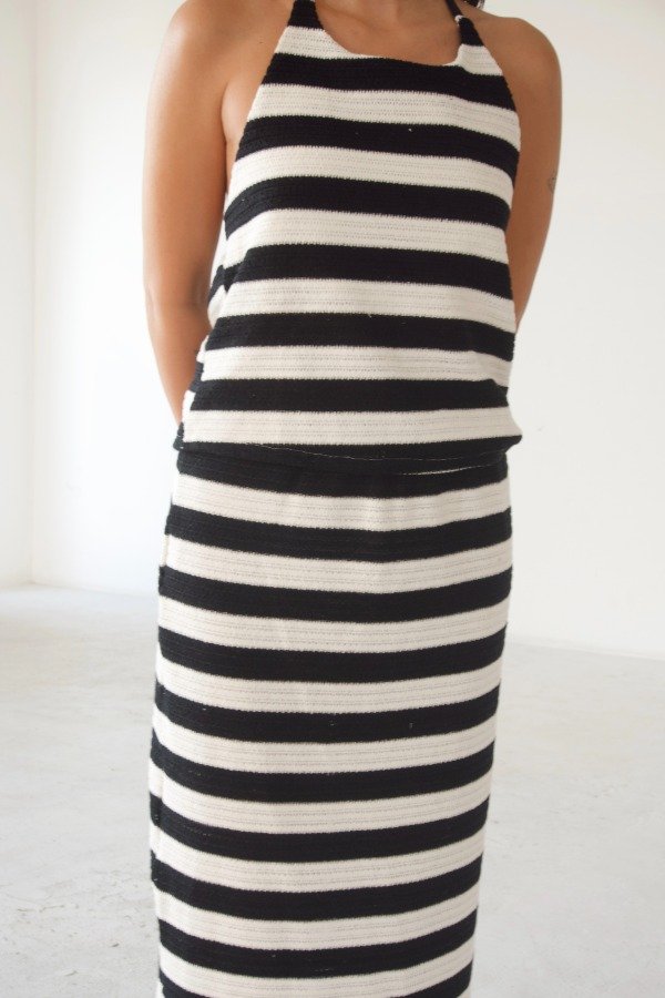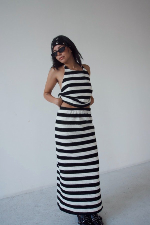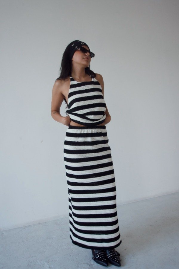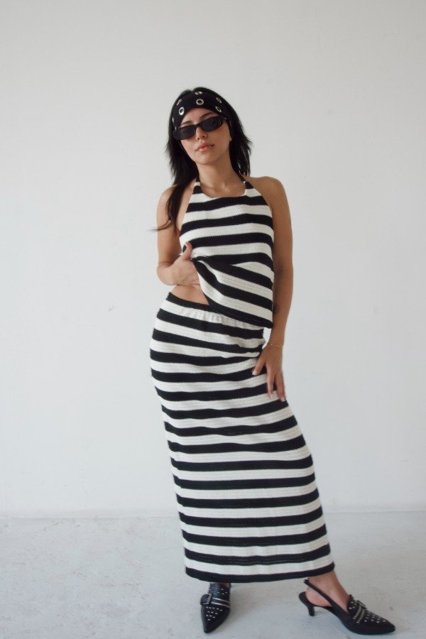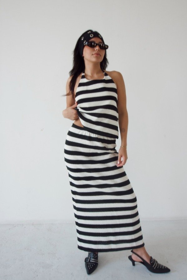 Pollera larga rayada con tajo lateral y elástico en cintura.
