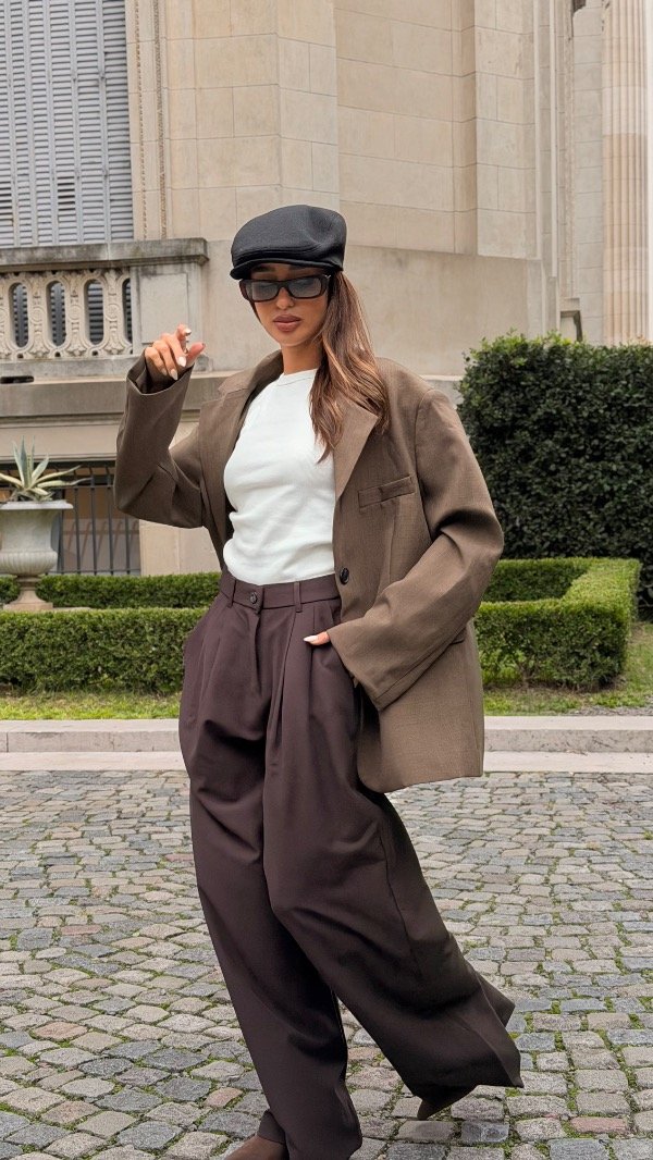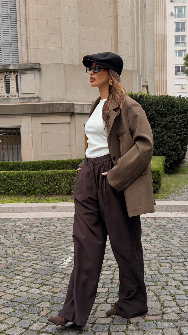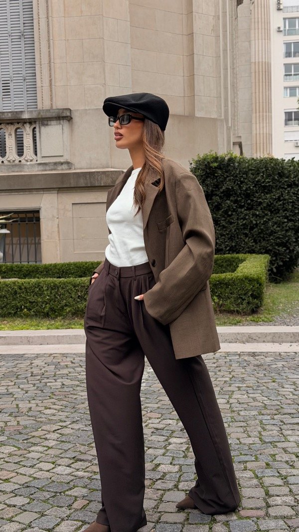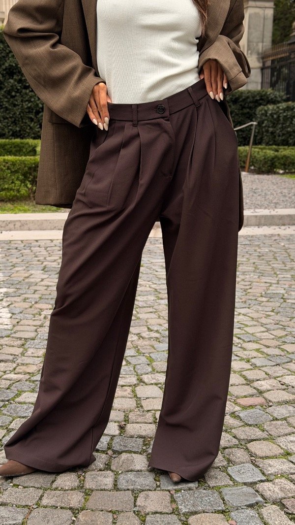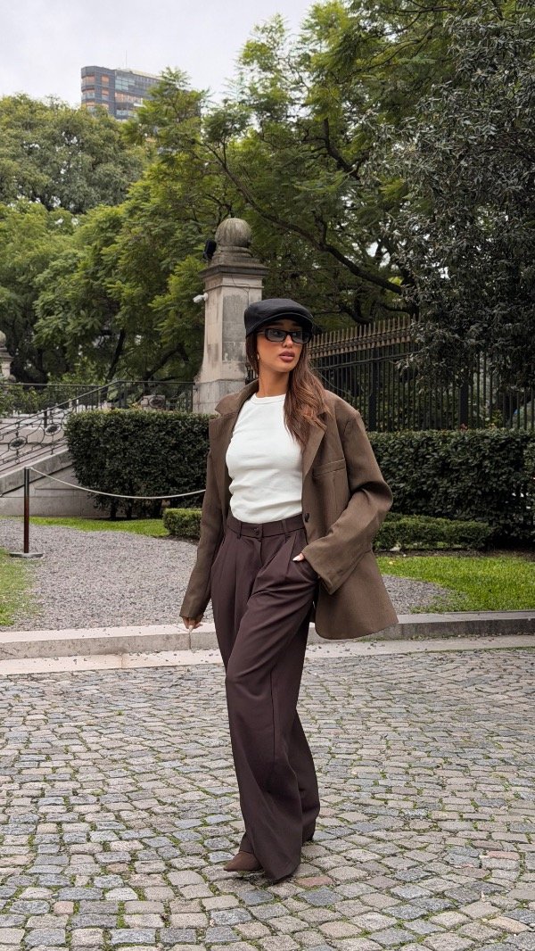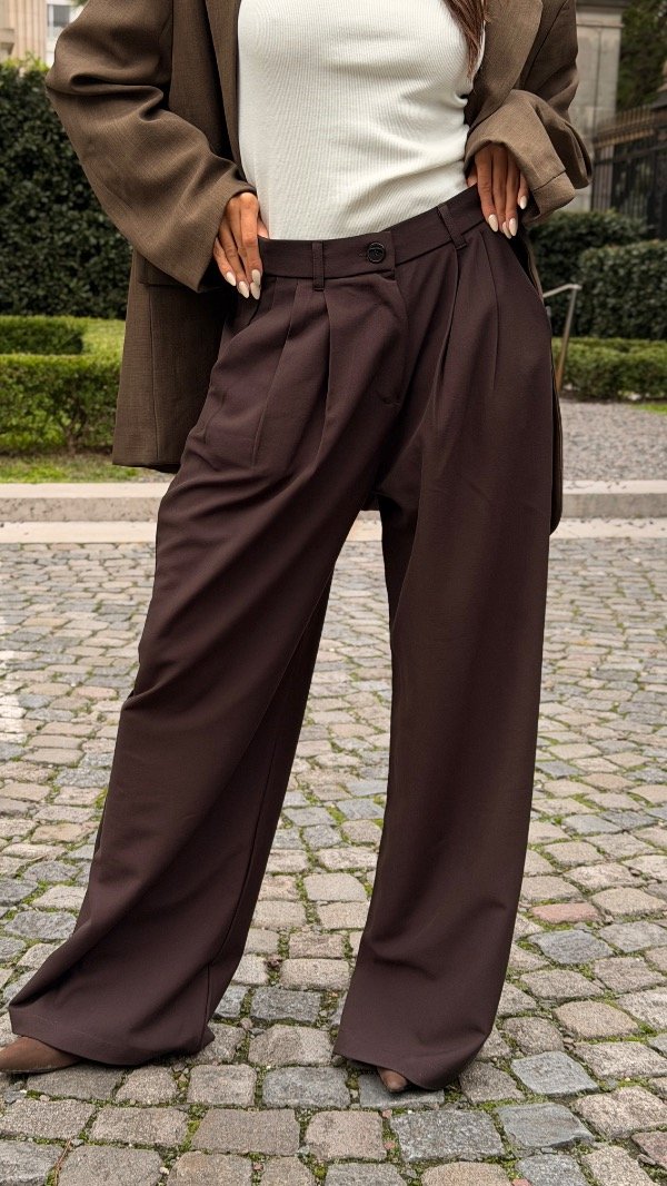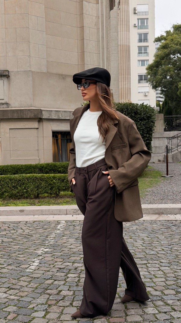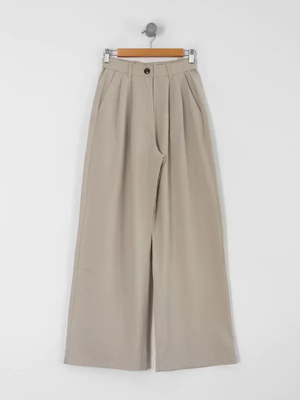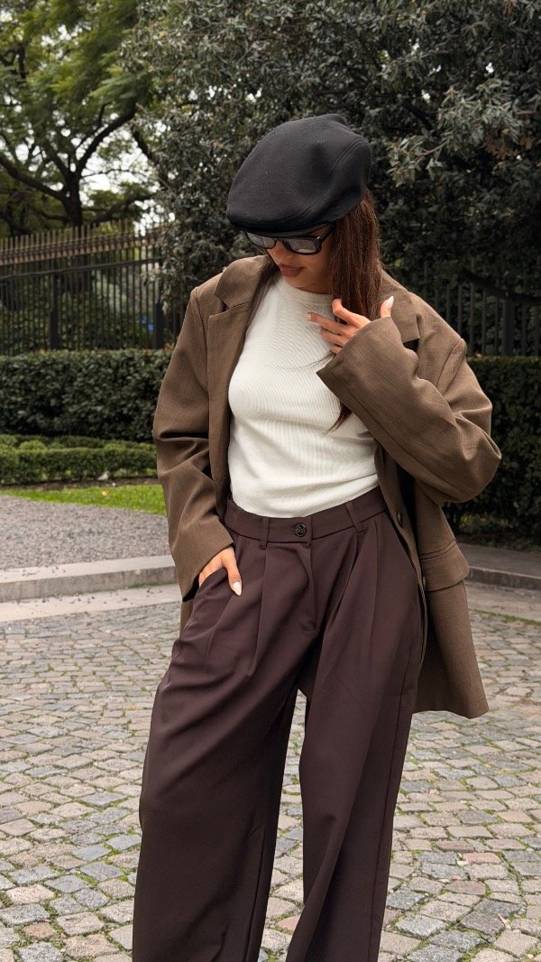 Wide leg con doble pinza, elástico en la espalda y bolsillos laterales. Tiene botón en el costado de la prenda.