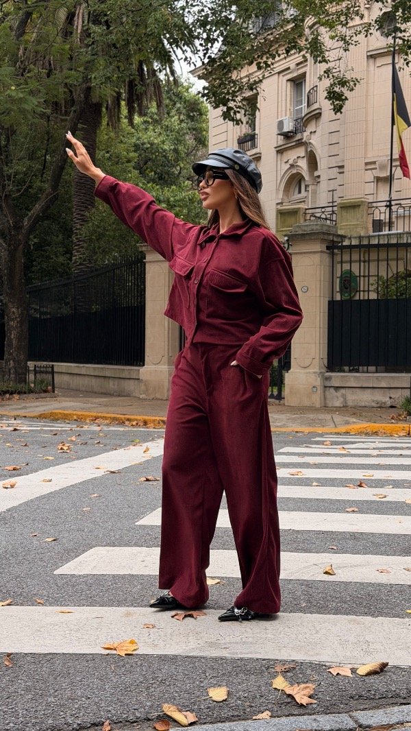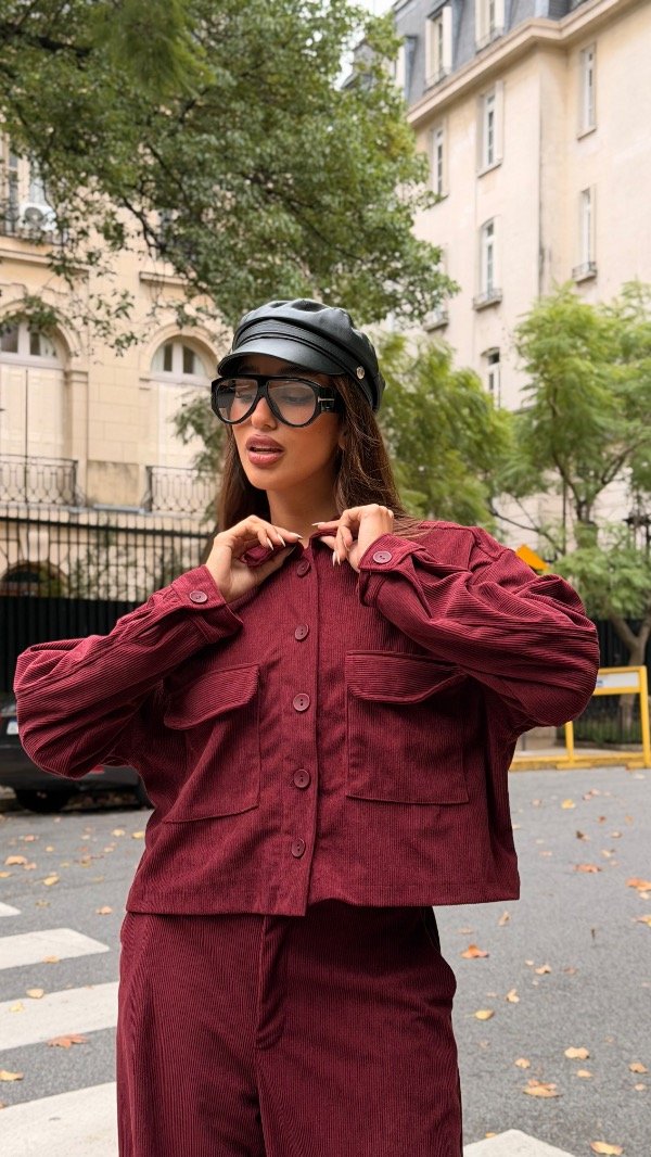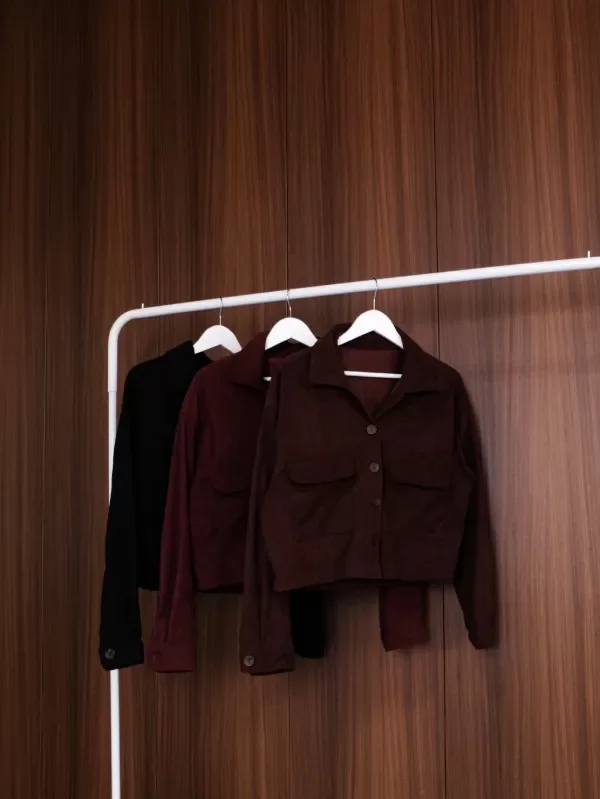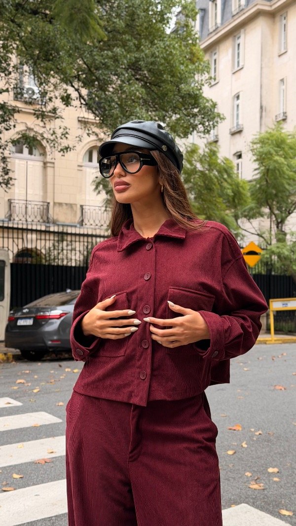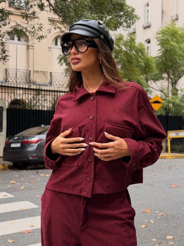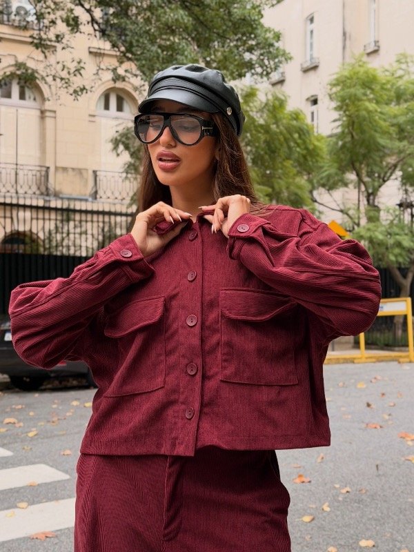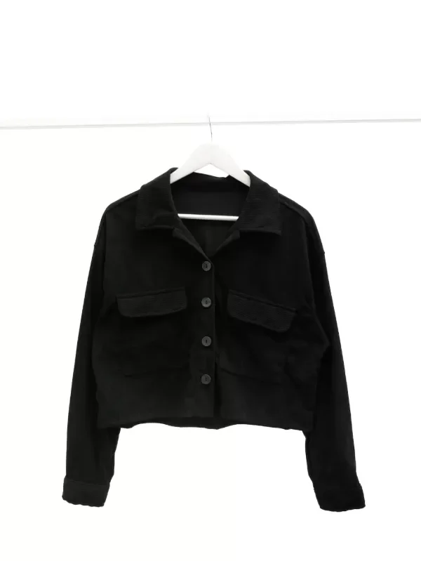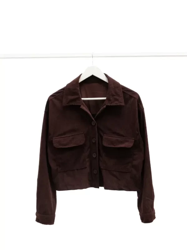 Campera amplia con terminación corta, bolsillos delanteros y botones al tono.