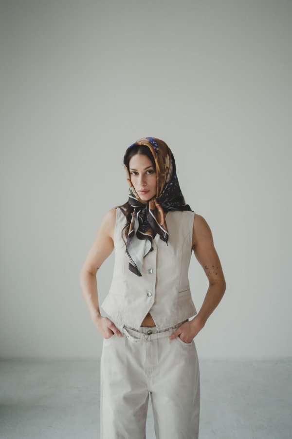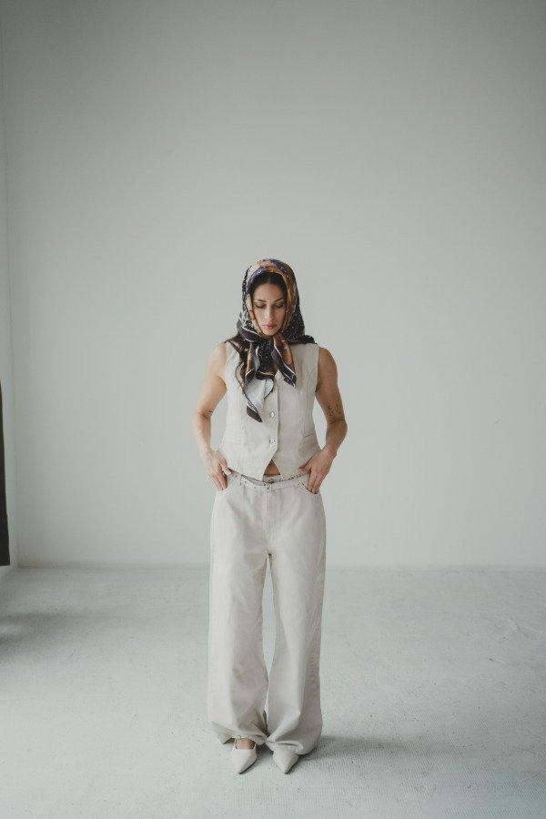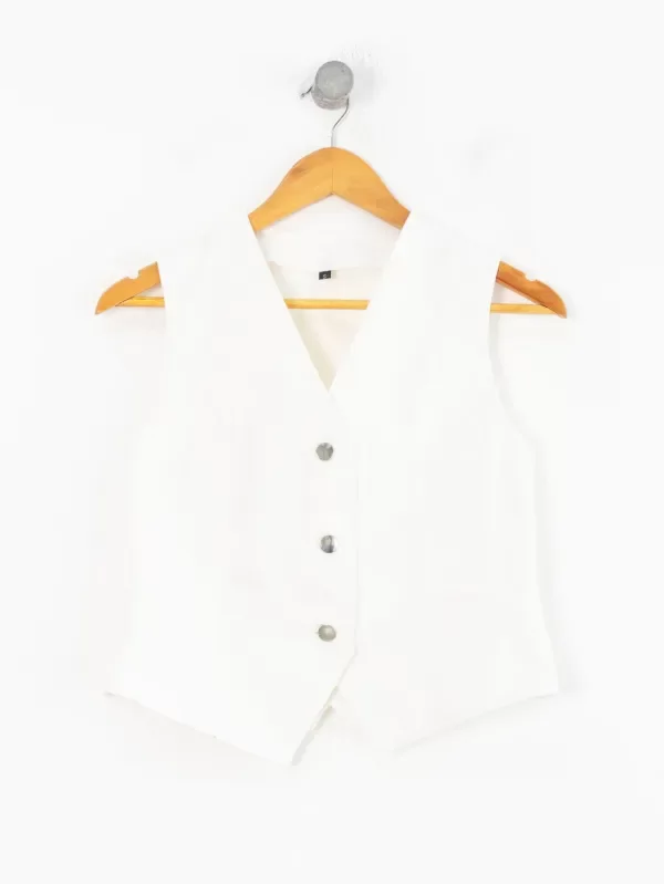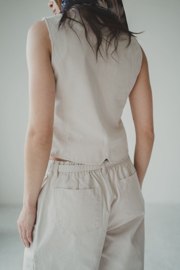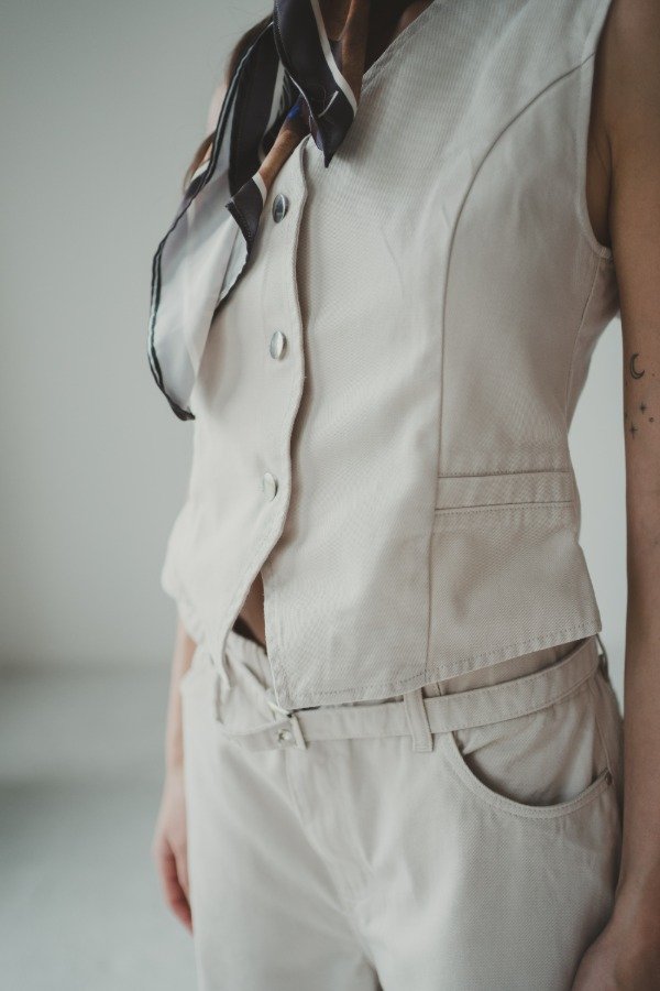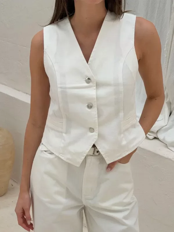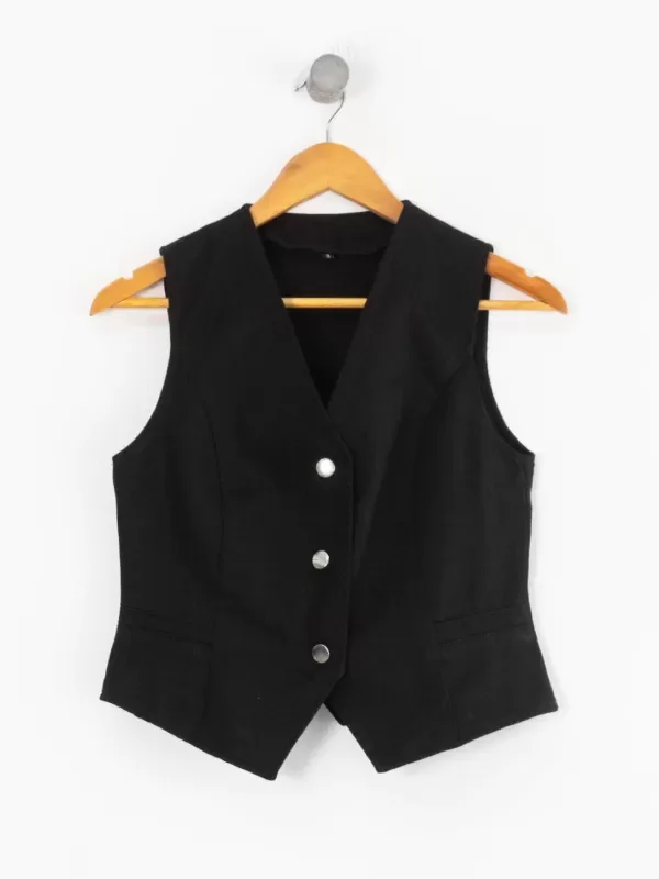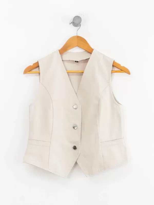Chaleco con botones de metal. Bolsillos no funcionales y pinzas delanteras. Combinalo con wide leg EMI