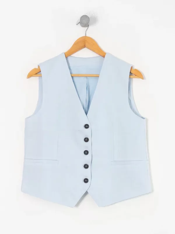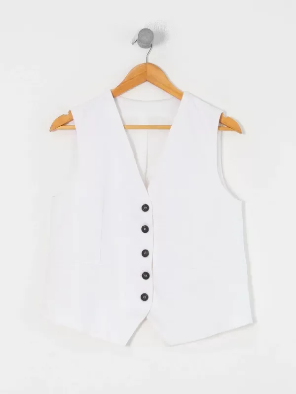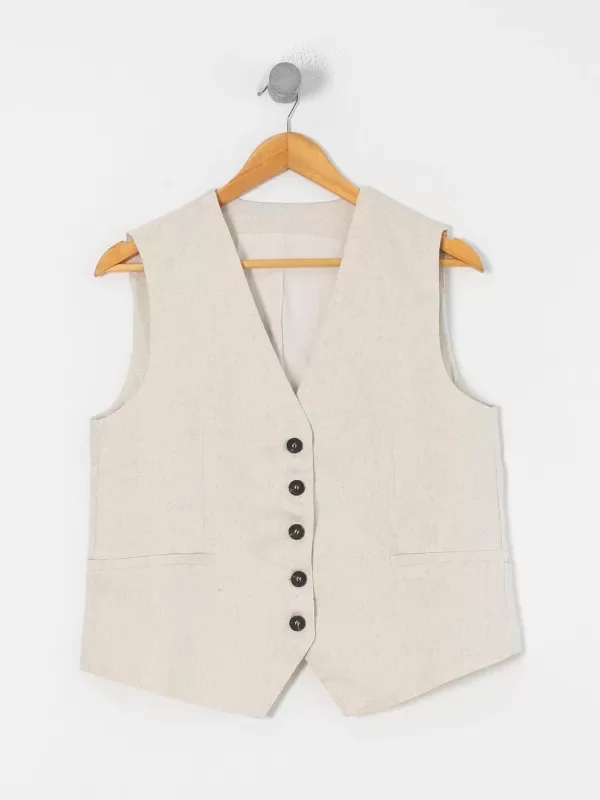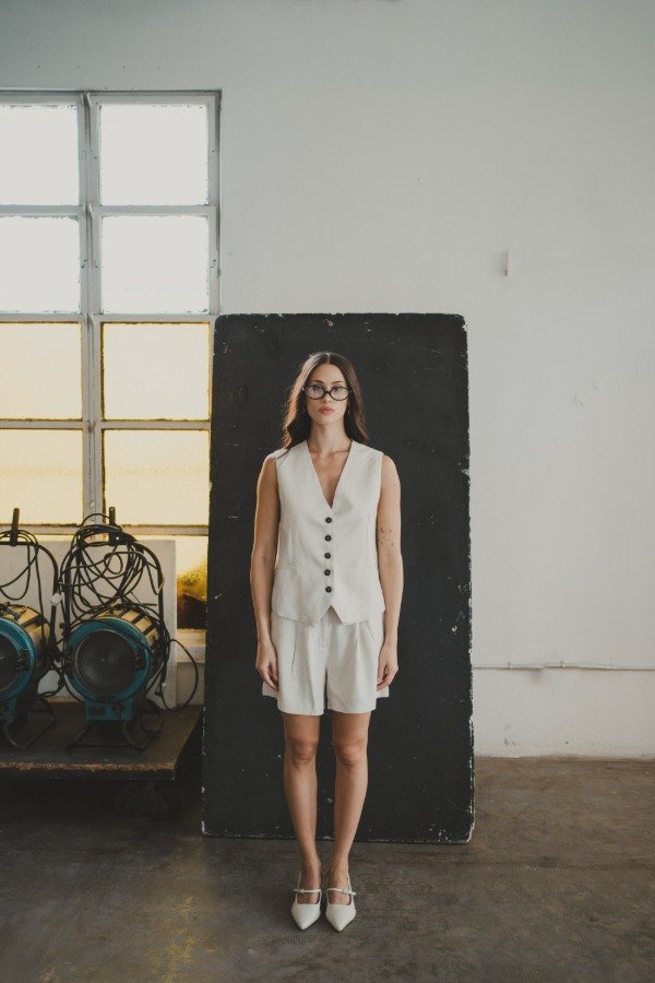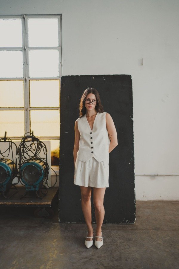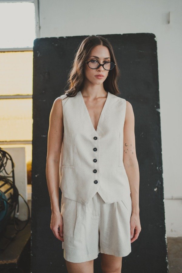 Chaleco oversized confeccionado con lino. Pinzas y bolsillos no funcionales en el delantero. Combinalo con el short oversized