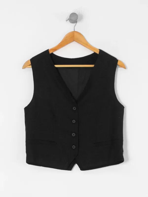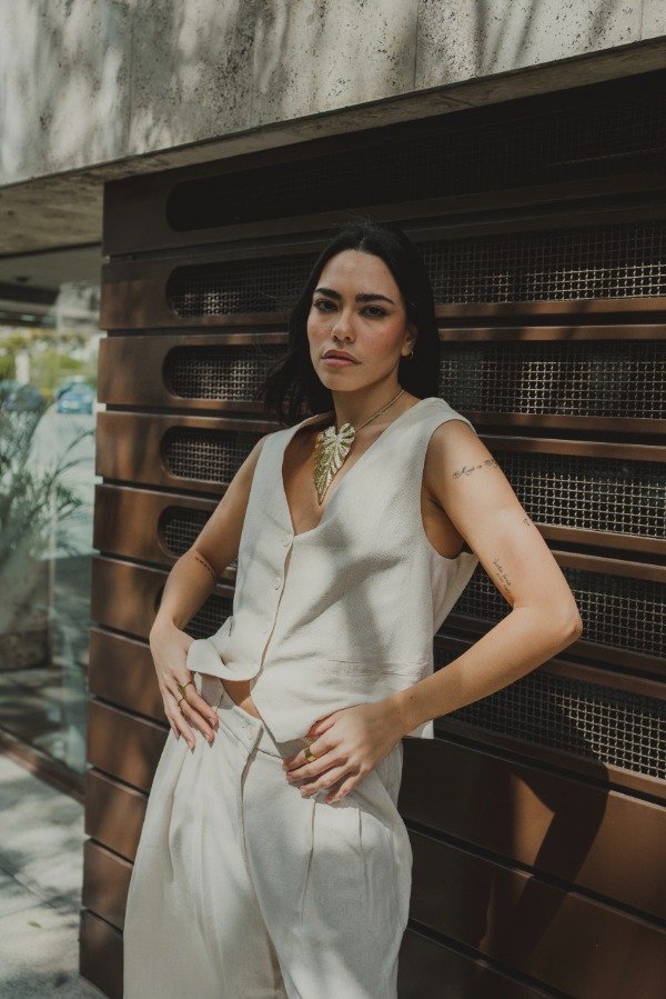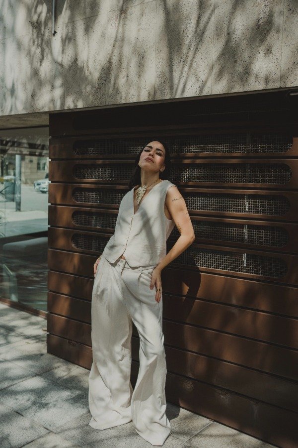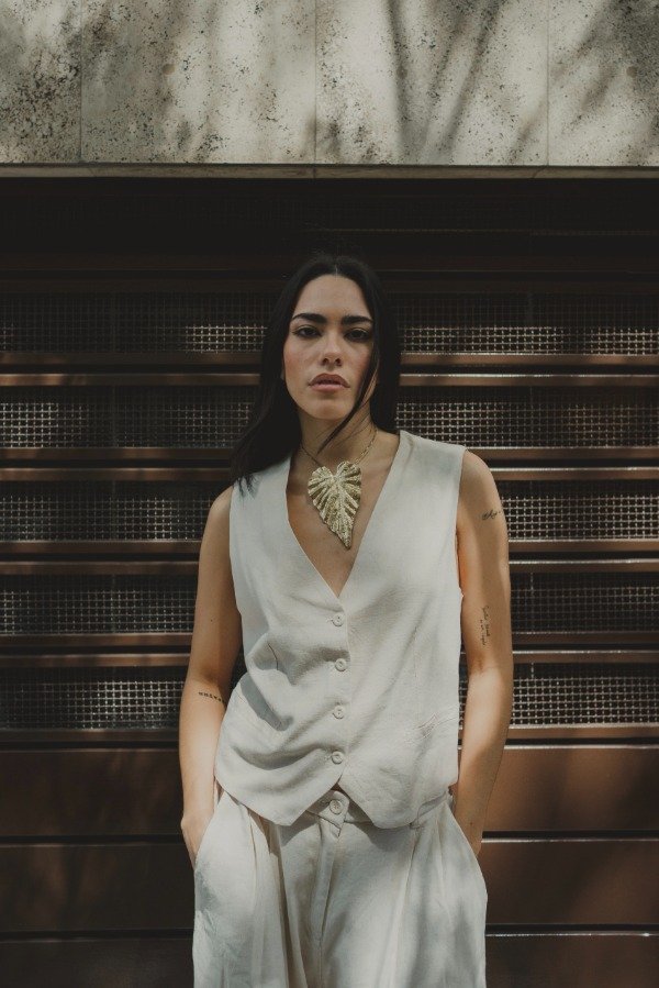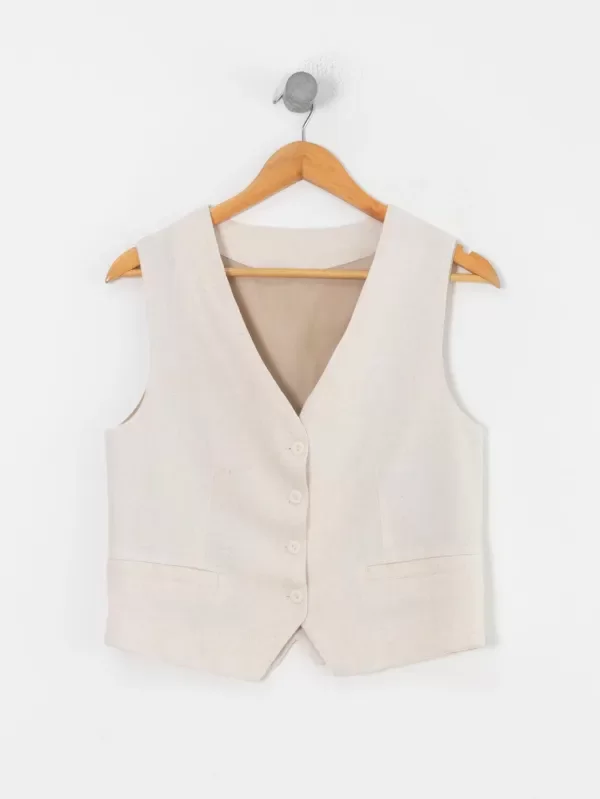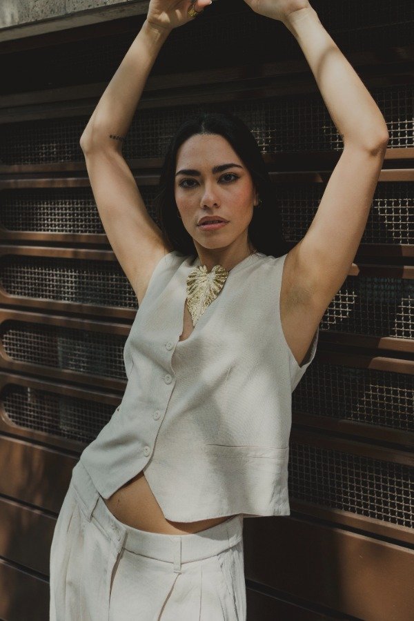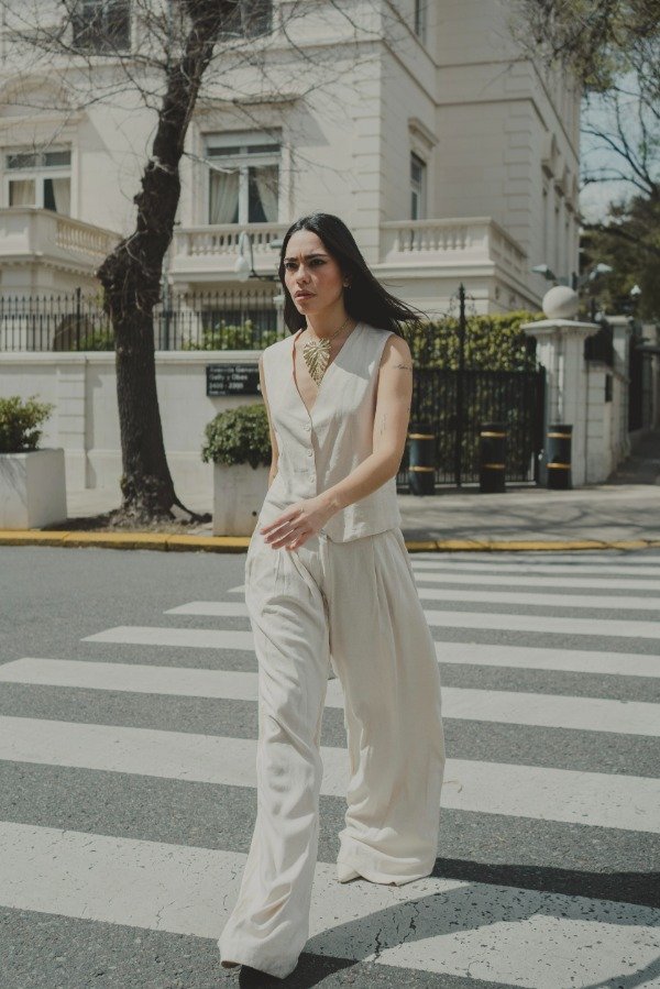 Chaleco con pinzas y bolsillos no funcionales en el delantero. Tiene forrería en su interno. Combinalo con el wide leg PILAR